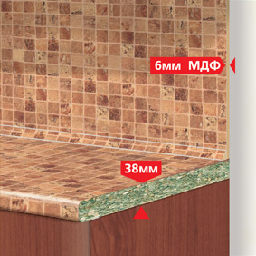 Стеновая панель идеально подходит под цвет столешницы, стык между ними закрывается уплотнительным плинтусом, что украшает изделие и повышает его эксплуатационные характеристики.
